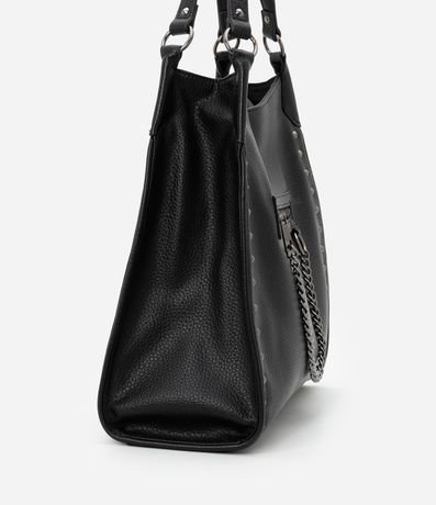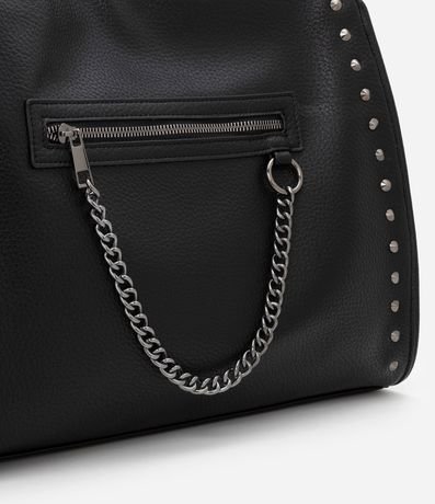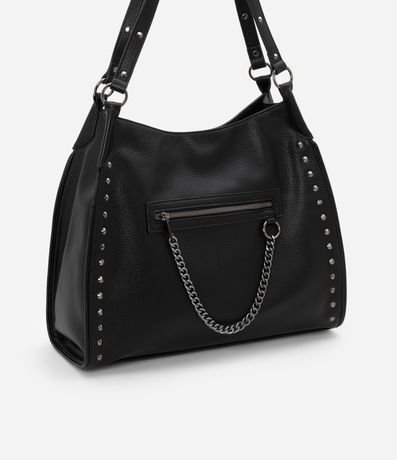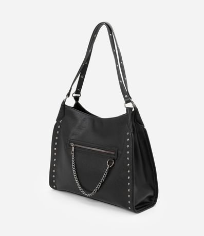 Bolsa feminina confeccionada em material sintético no tamanho grande, no modelo hobo, peça com alças duplas, detalhes de spike e metais, com corrente e bolsinho frontal.