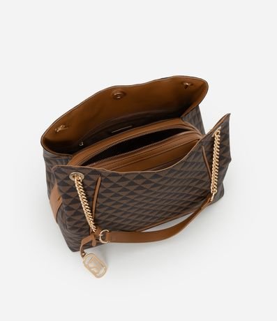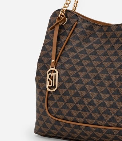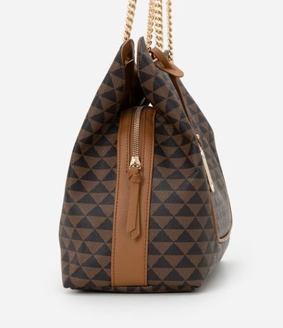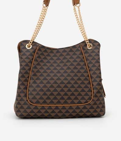 Ref: Bolsa grande em PU, com estampa de triângulos e detalhe de corrente na alça.