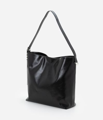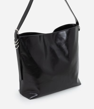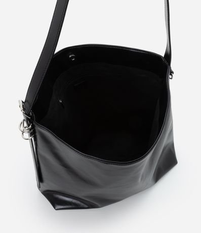 Bolsa feminina confeccionada em material sintético, modelo hobo grande com fechamento por botão de pressão, detalhe de elos em metal na alça longa.