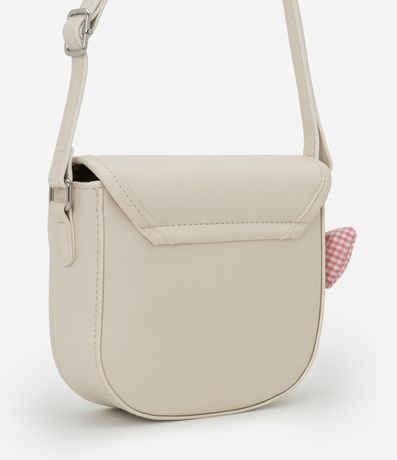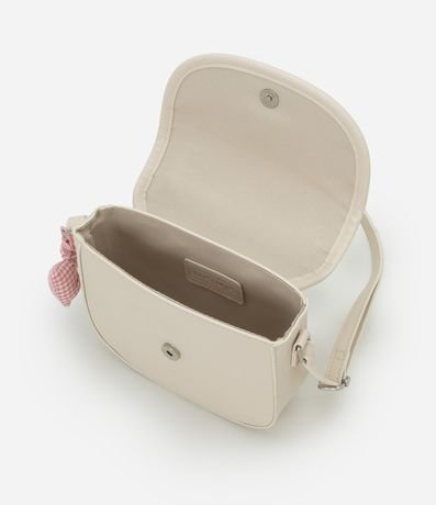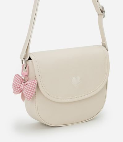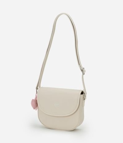Bolsa infantil confeccionada em PU com acabamento liso e estrutura compacta. Possui formato transversal, alça ajustável, aba frontal com fechamento por botão magnético e aplicação decorativa removível com laço xadrez e pingente de coração, trazendo charme delicado ao visual do dia a dia.