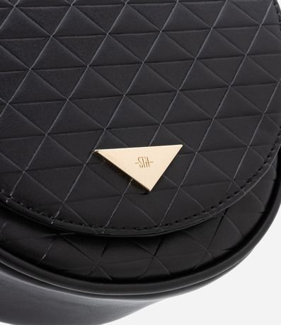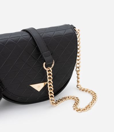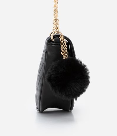 Ref: Bolsa transversal pequena com formato de meia lua, com alça em corrente, tampa com fechamento por botão de pressão, bolsinho interno com zíper, textura matelassê e pompom fofinho na alça.