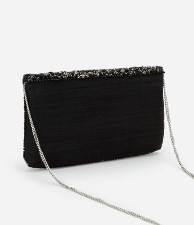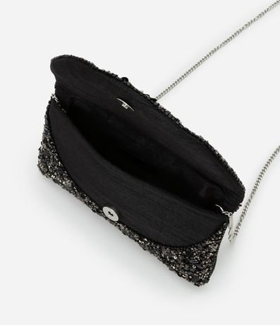 Bolsa transversal pequena com fechamento por tampa e alcinha de corrente transversal. Peça com miçangas e paetês aplicados.