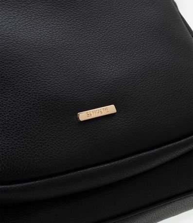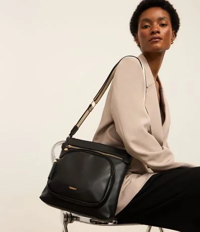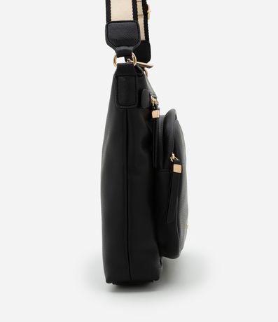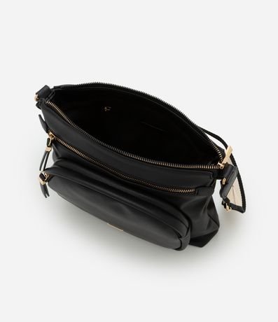 Bolsa feminina em material sintético média, peça no modelo postman com fechamento por zíper, bolso frontal e alça contrastante em gorgorão.