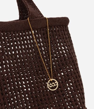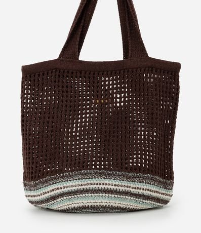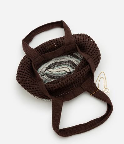 Bolsa saco feminina em poliéster com corpo em tricô de trama vazada e alças em ponto fechado. A base traz faixa listrada em diferentes tons, e a abertura possui borda reforçada. Acompanha pingente metálico fixado na lateral.