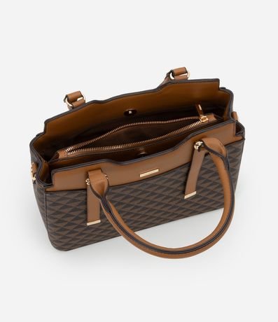 Ref: Bolsa feminina satchel média com alça de mão, alça longa removível, fechamento por zíper, estampa triangular e detalhes de metal.