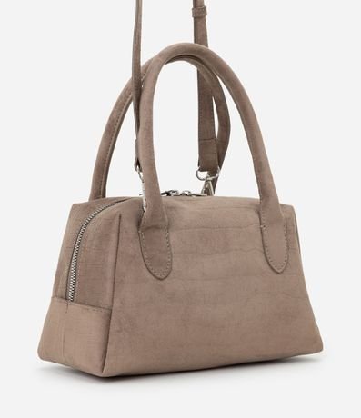 Bolsa média feminina em suede texturizado com efeito croco, confeccionada com poliéster mais sustentável. Possui modelo satchel com alças firmes fixas, alça longa removível e zíper duplo metálico.