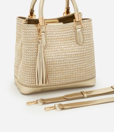 Ref: Bolsa feminina satchel média com divisórias e fechamento com lapela, efeito palha, alça de mão, alça longa removível e detalhe de tássel.