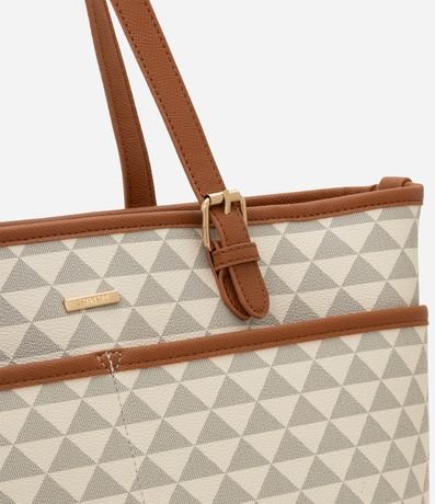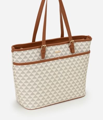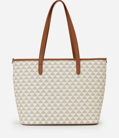 Bolsa feminina modelo shopper confeccionada em PU, design grande com estampa geométrica de triângulos, alça longa móvel com detalhe, fechamento por zíper, bolso interno e acabamentos metálicos que garantem praticidade e estilo sofisticado para o dia a dia.