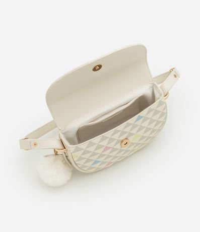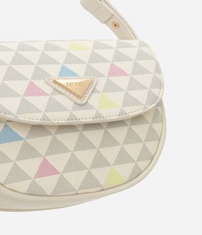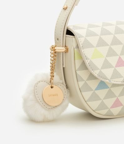 Bolsa shoulder, confeccionada em material sintético, com alça de ombro, fechamento por tampa, estampa geométrica de triângulos. Peça com pompom pendente.