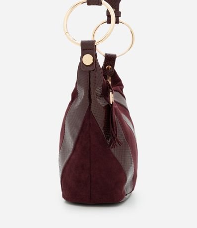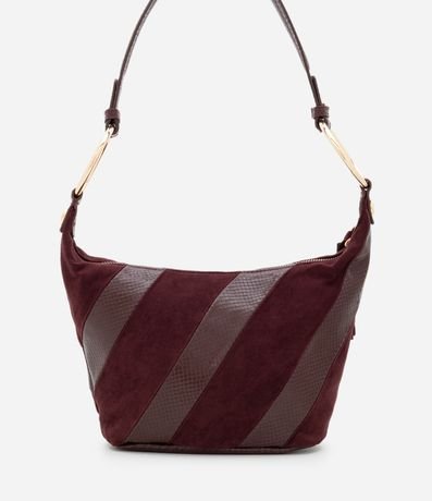 Ref: Bolsa feminina shoulder em suede confeccionada com poliéster mais sustentável. Possui tamanho médio, faixas diagonais em PU, alça curta com aro metálico e zíper superior.