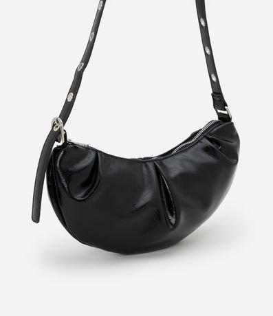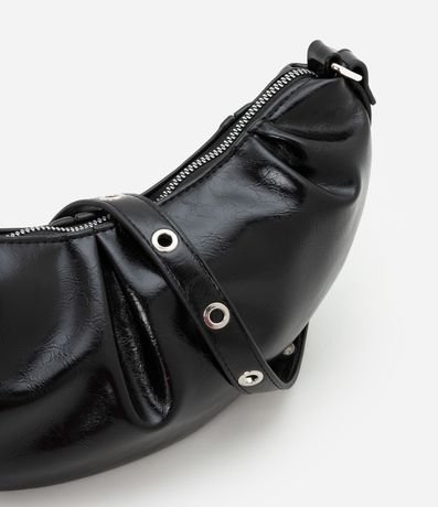 Ref: Bolsa shoulder, meia lua, alça de ombro com ilhóses, fechamento por zíper, confeccionada em material sintético, pu e com detalhes frontais estilo gota.