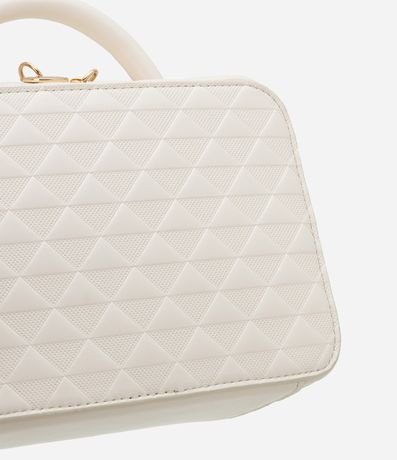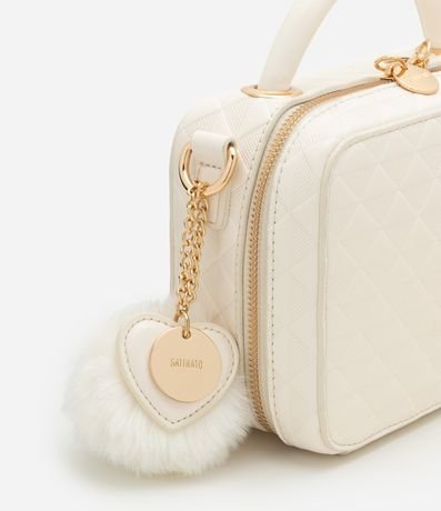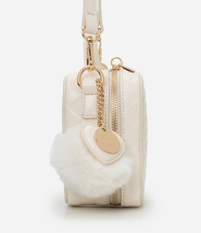 Ref: Bolso camera bag transversal em material sintético com texturizado, alças finas reguláveis removíveis, fechamento por zíper e pompom pendurado.