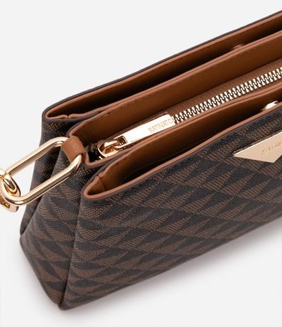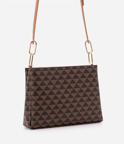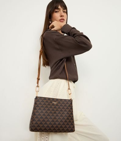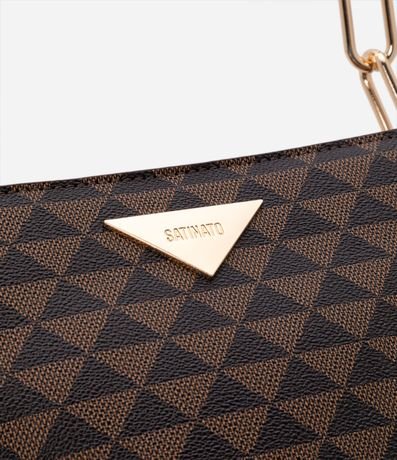Ref: Bolsa feminina de modelo triângulo, com alça transversal e 03 bolsos. Possui estampa de triângulos e plaquinha metalizada.