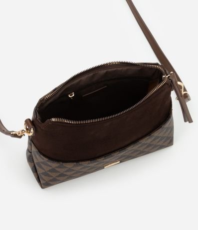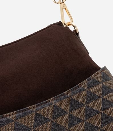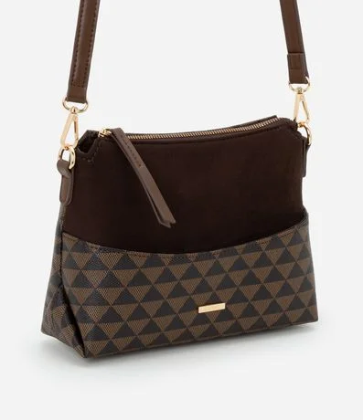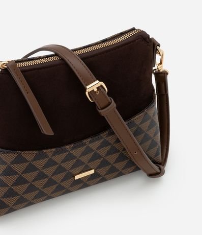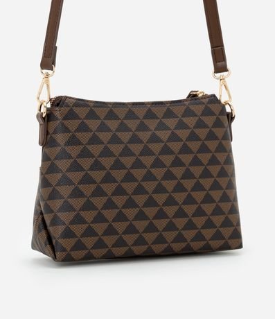 Ref: Bolsa feminina confeccionada em material sintético no modelo transversal, média, com alça longa fina ajustável removível, com fechamento por zíper, bolso externo com estampa triangular.