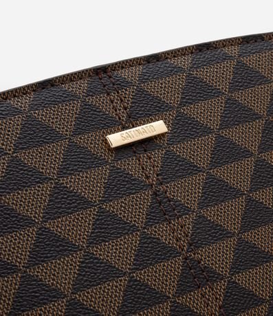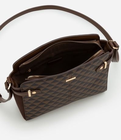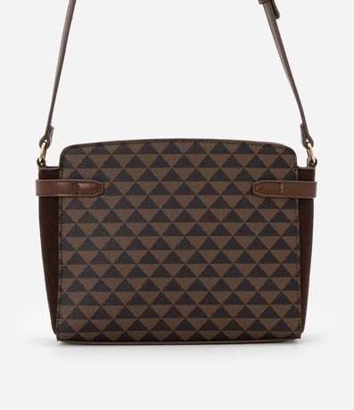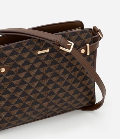 Ref: Bolsa feminina transversal média com fechamento de zíper, detalhes contrastantes, alça longa ajustada com fivela lateral e estampa de triângulos.