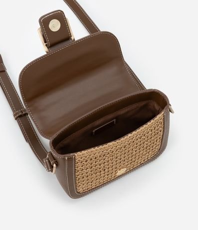 Ref: Bolsa feminina transversal pequena com tampa, lapela com fivela, alça longa ajustável e efeito ráfia.