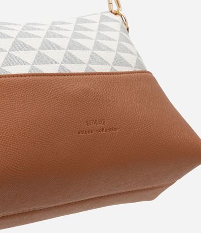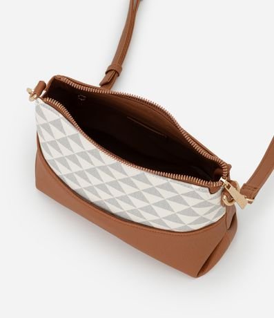 Ref: Bolsa feminina transversal pequena, com fechamento por zíper, alça longa removível, estampa triangular e detalhes contrastantes.