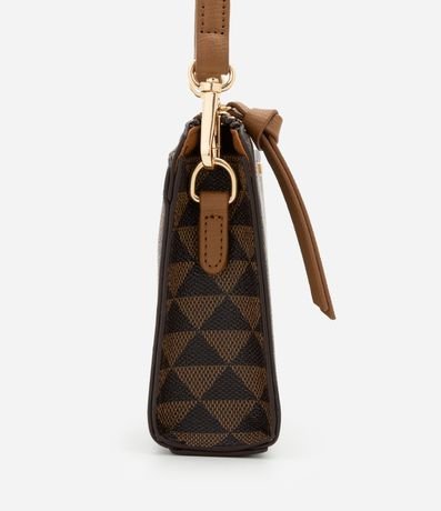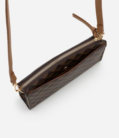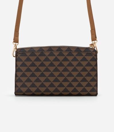 Ref: Bolsa feminina confeccionada em material sintético com fibras certificadas, pequena no modelo transversal, com estampa de triângulos, fechamento por zíper com puxador e alça longa.