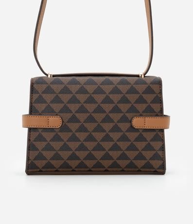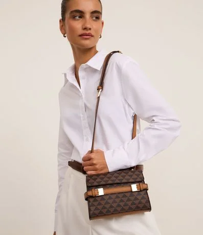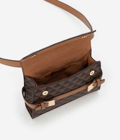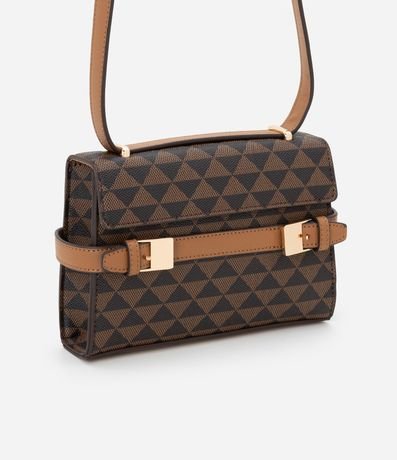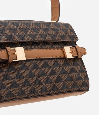 Ref: Bolsa feminina confeccionada em material sintético, peça no modelo transversal pequena com tampa, alça média ajustável, estampa triangular com cinto de fivela dupla.
