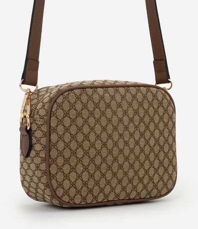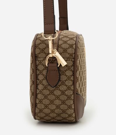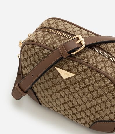Ref: Bolsa transversal, pequena confeccionada em material sintético, pu, textura geométrica, metais aplicados e recortes em pu nas laterais.