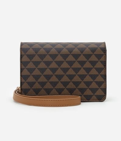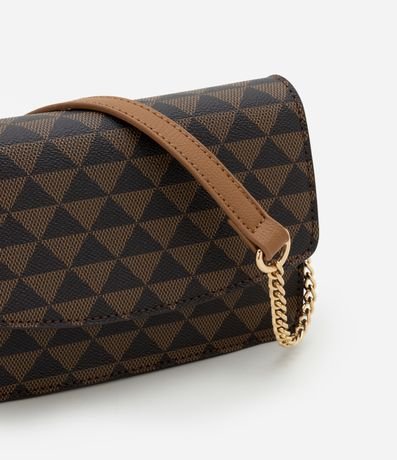 Ref: Bolsa feminina confeccionada em material sintético no modelo transversal pequena com estampa triangular, peça com tampa e alça de corrente contrastante.