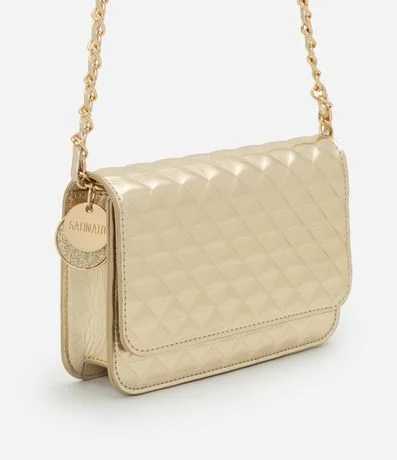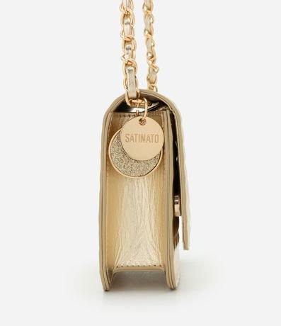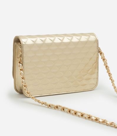 Bolsa transversal pequena, com alça em corrente com pendente redondo, textura matelassê, divisória interna com zíper e efeito metalizada.