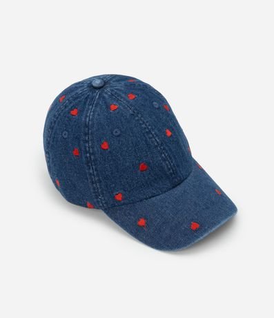 Ref: Boné jeans com aba curva e bordados de coraçõezinhos.