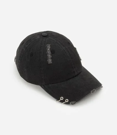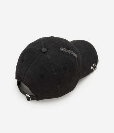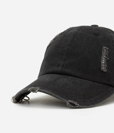 Ref: Boné estilo sarja confeccionado em algodão mais sustentável. Possui aba curva, detalhes desfiados e pequenos rasgos espalhados na borda, argolas metálicas na lateral da aba, fechamento ajustável na parte traseira através de uma fivela metálica deslizante e acabamento em jeans envelhecido.
