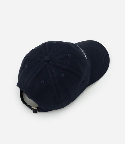 Boné aba curva, confeccionado em sarja, regulador na parte de trás e lettering bordado na parte da frente.