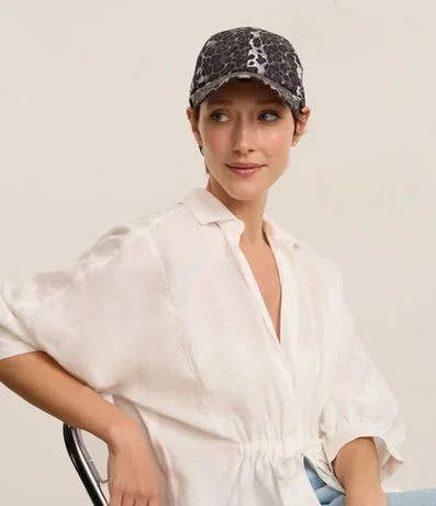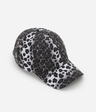 Ref: Boné feminino, de modelo aba curva, confeccionado em sarja leve, com estampa de oncinha e regulador com fivela.