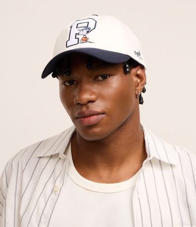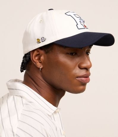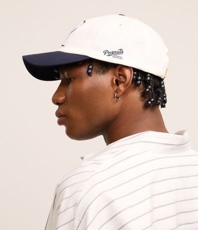 Boné masculino, confeccionado em sarja, com 06 panel, aba curta contrastante, bordado do Snoopy na temática de baseball, fechamento em strapback.