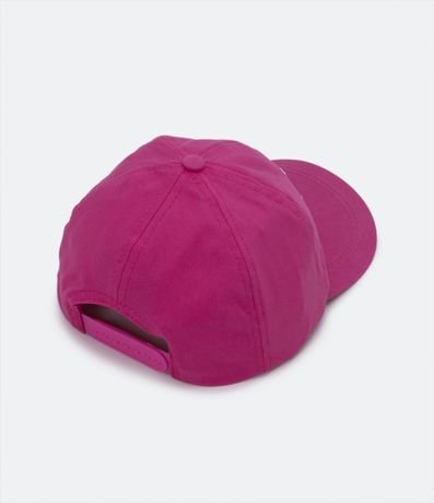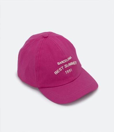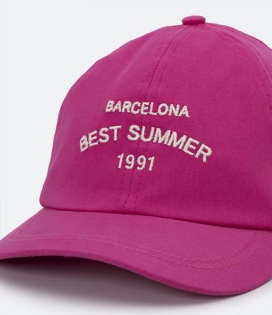 Boné infantil em sarja, com aba curva, bordado frontal com escritos Barcelona e fechamento com ajuste.