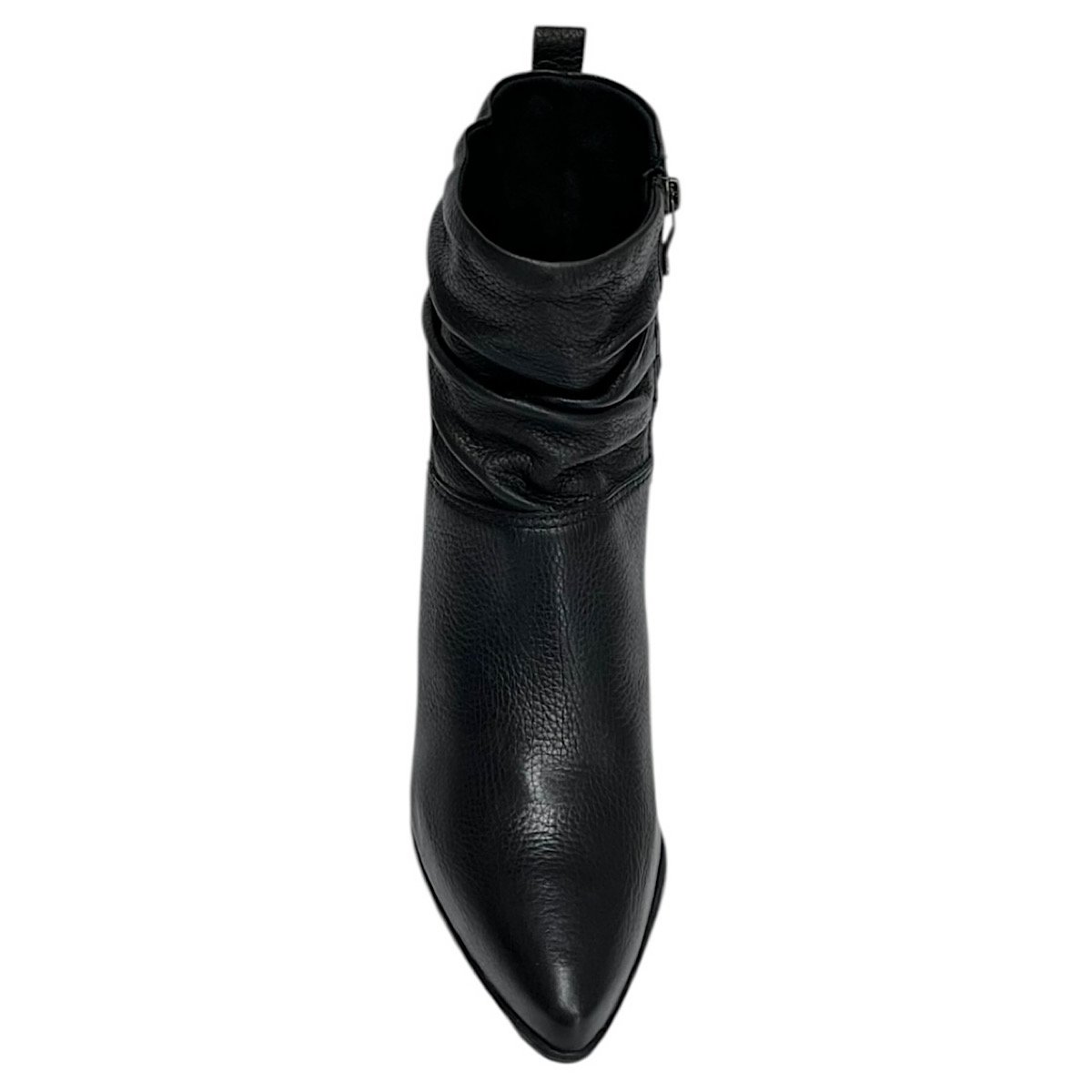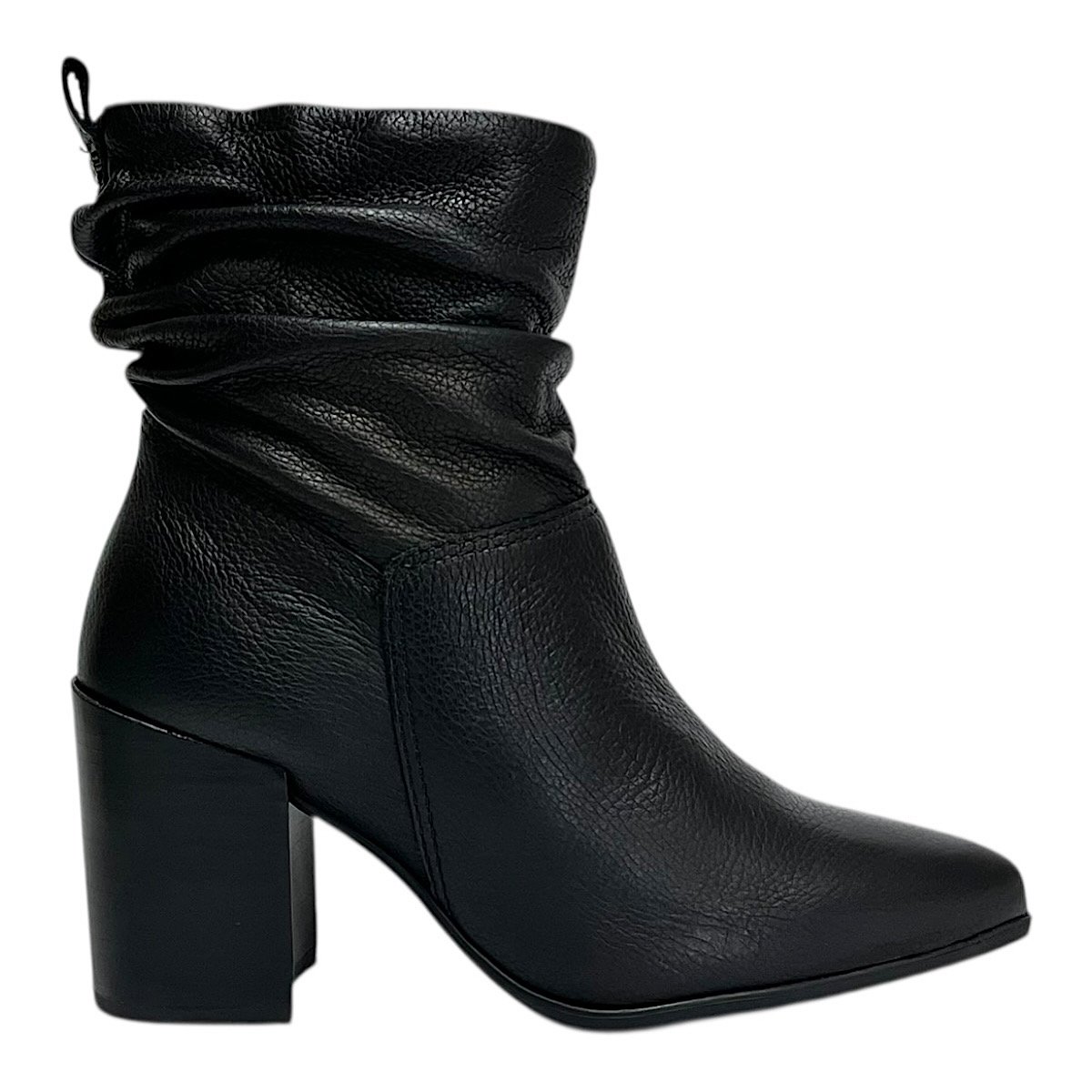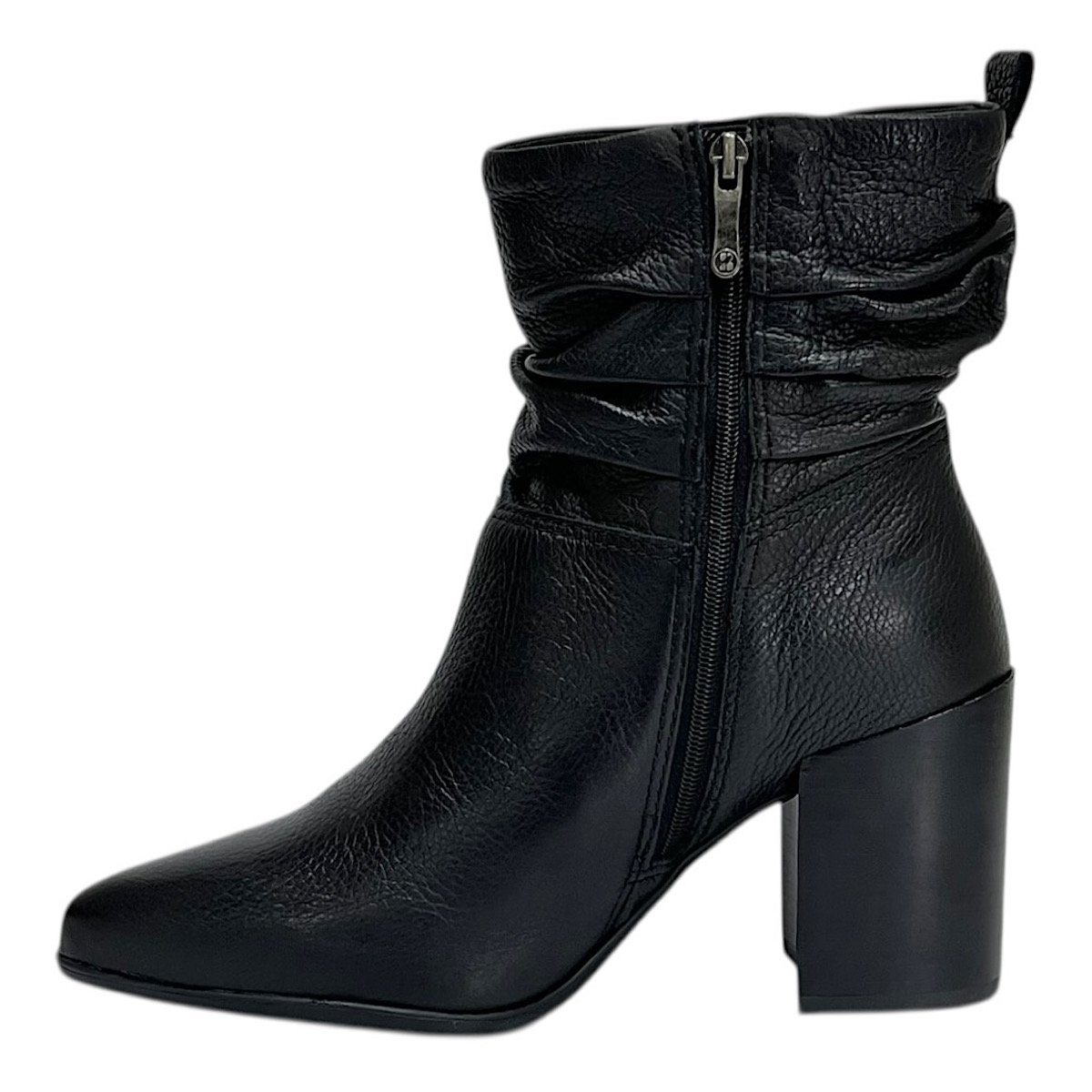 O cano baixo com efeito franzido caracteriza o estilo slouchy, trazendo movimento e personalidade ao calçado, além de permitir combinações versáteis com diferentes propostas de looks. O bico fino acrescenta elegância ao visual, alongando a silhueta e reforçando o estilo refinado da bota.
