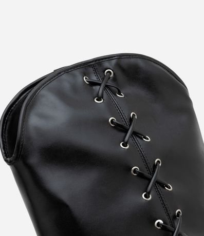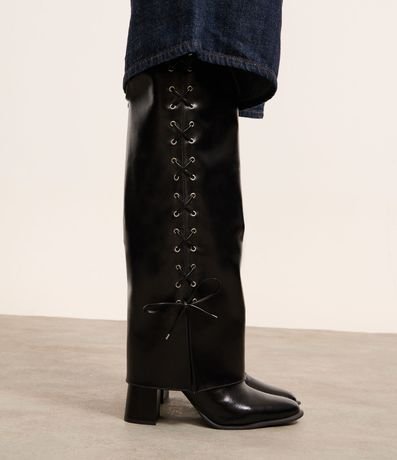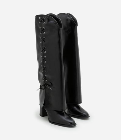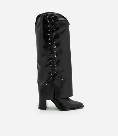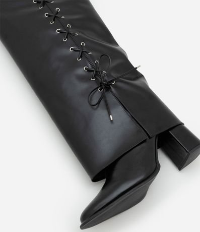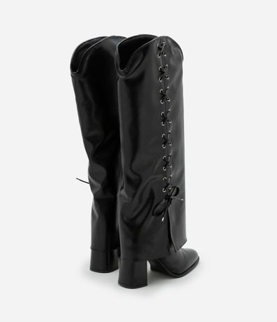 Ref: Bota feminina confeccionada em material sintético, com cano alto, lapela e bico amendoado peça contem detalhe moderno de lace up na lateral e salto alto.