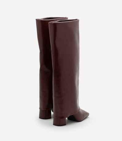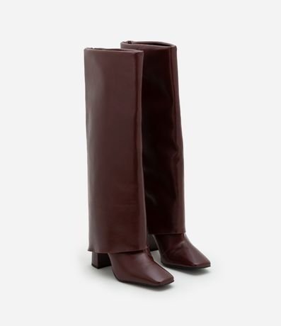 Ref: Bota feminina confeccionada em PU, com cano alto, bico quadrado, salto e pala longa.