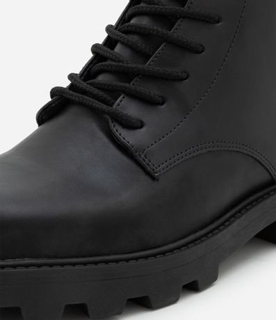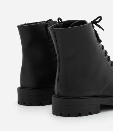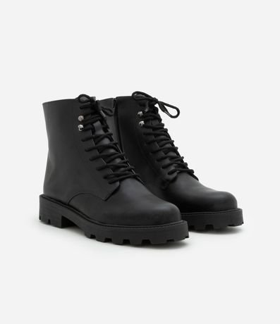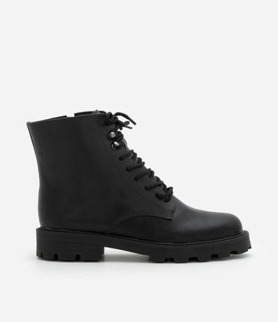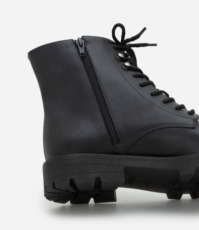 Ref: Bota feminina confeccionada em material sintético. Possui cano curto, bico redondo, sola tratorada, salto médio, cadarços frontais com passadores metálicos e zíper lateral.