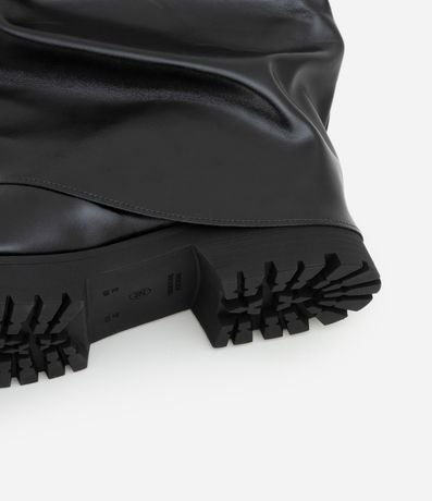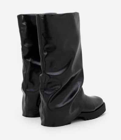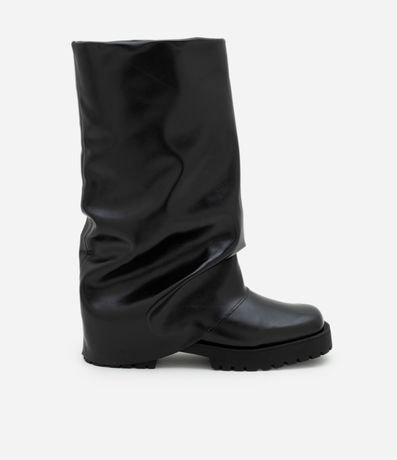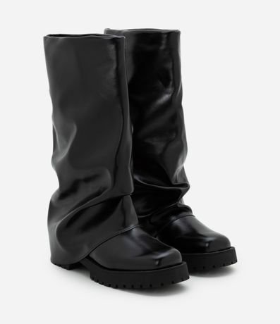 Ref: Bota feminina confeccionada em material sintético com cano alto, bico quadrado, salto médio e pala.