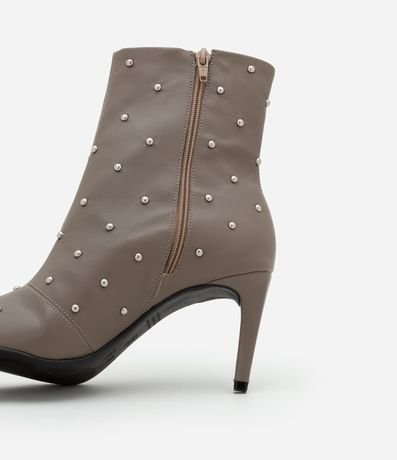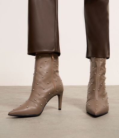 Bota cano médio feminina, confeccionada em PU, com bico e salto finos, fechamento em zíper na lateral interna e tachinhas aplicadas na superfície.