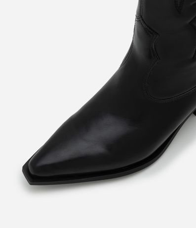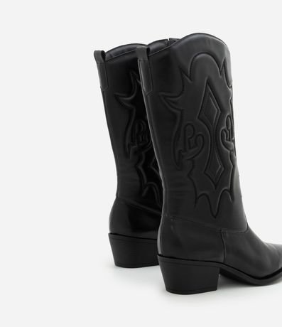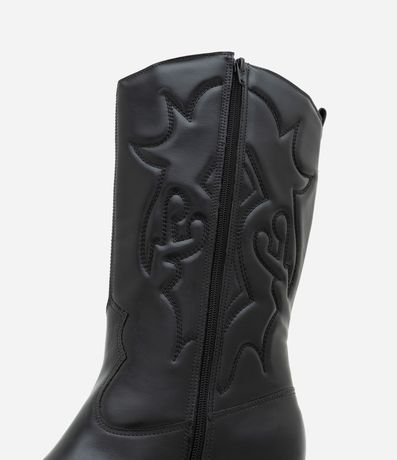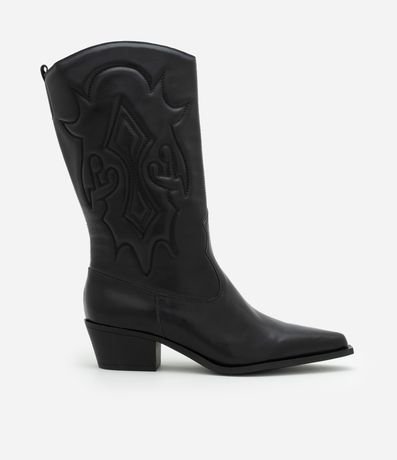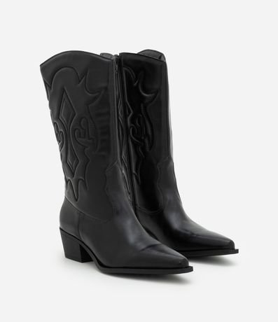 Ref: Bota feminina em PU de cano médio, bico fino alongado e salto blocado. O cabedal possui bordados em relevo nas laterais e fechamento em zíper na parte superior.