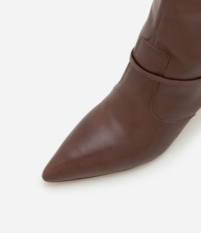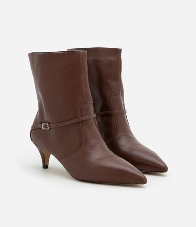 Ref: Bota cano médio feminina, confeccionada em couro, com bico fino, fechamento em zíper e detalhe de fivela na lateral. O modelo também possui salto kitten heel.