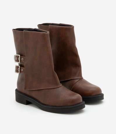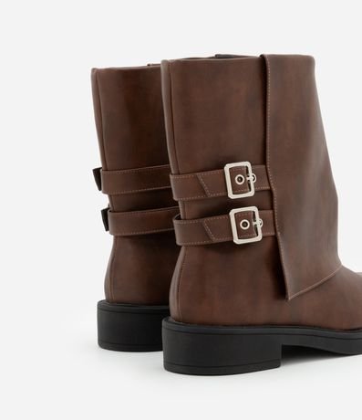 Ref: Bota cano médio feminina, confeccionada em PU, com pala sobreposta no cano e detalhes de fivela lateral.