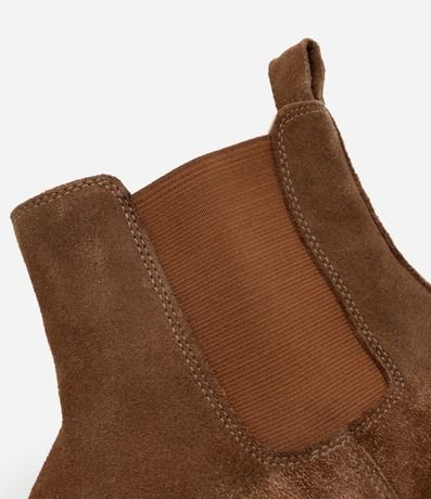 Ref: Bota masculina de modelo chelsea, confeccionada em couro camurça sustentável, com cano baixo de bico redondo.