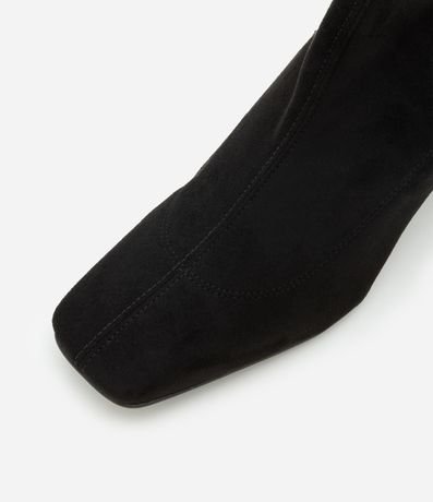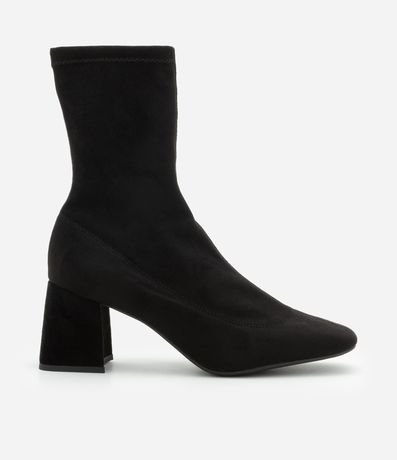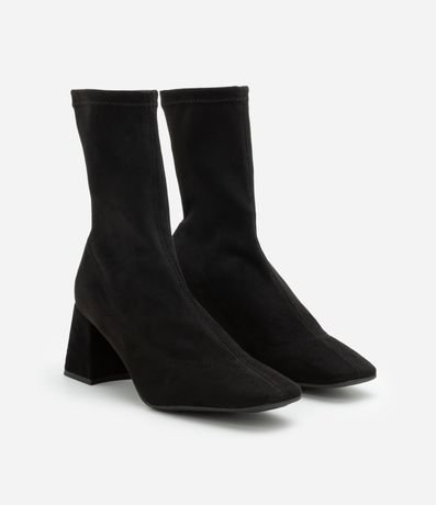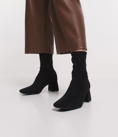 Bota cano curto em material têxtil, com bico quadrado e salto médio grosso.