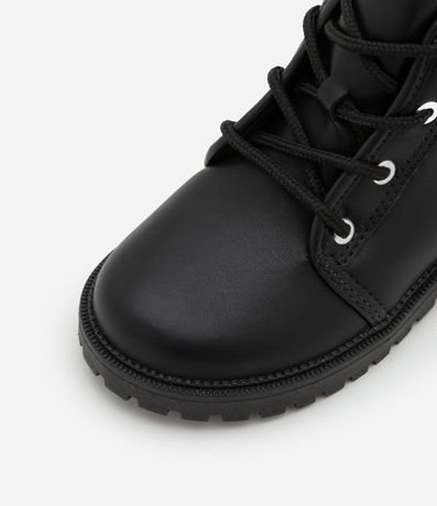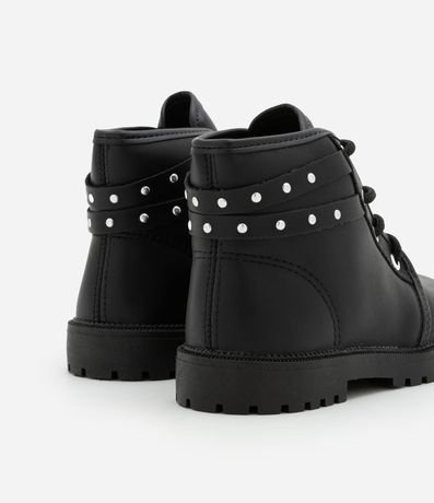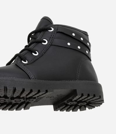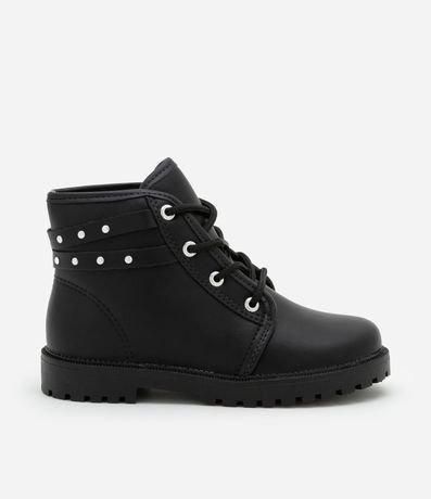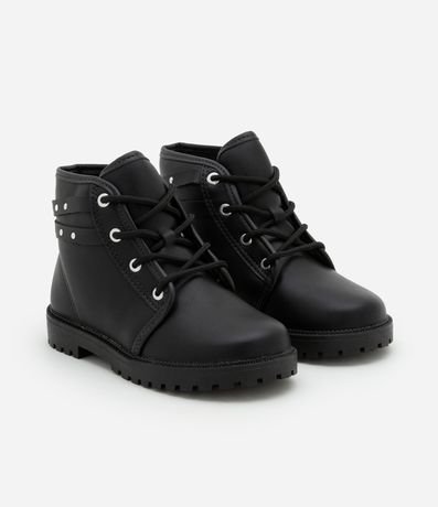 Bota infantil de modelo coturno, confeccionada em material sintético, com bico redondo e cano médio. Sem estampa, possui detalhe de duas tiras com tachinhas aplicadas. Possui fechamento por amarração.