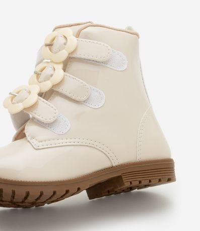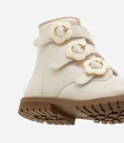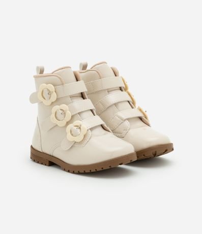 Bota infantil de modelo coturno, confeccionada em material sintético, com bico redondo e cano médio. Sem estampa, possui detalhe de três tiras com fivelinha em formato de flor, super estilosa e delicada!