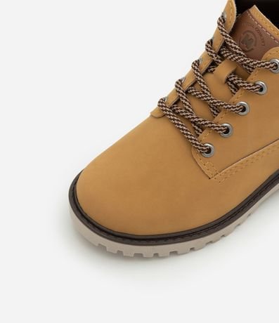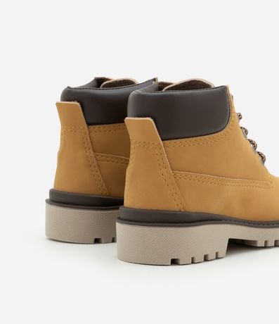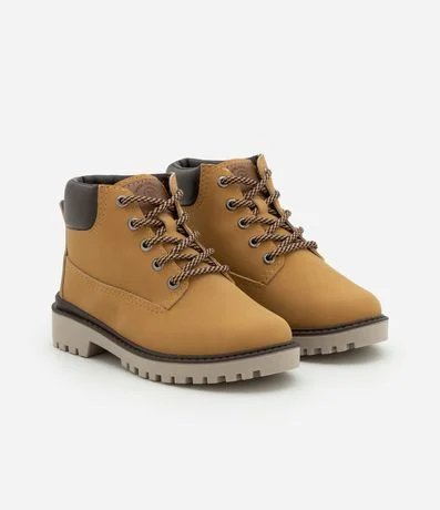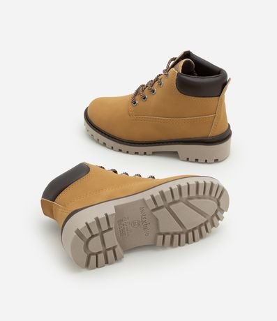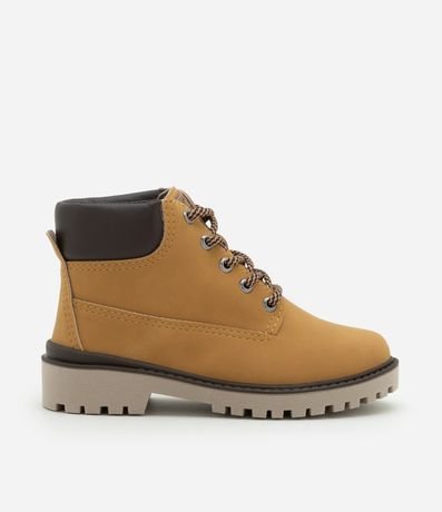 Ref: Bota infantil modelo coturno, confeccionado em material sintético, com cadarço xadrez, detalhes em recortes, tratorado e sola alta.