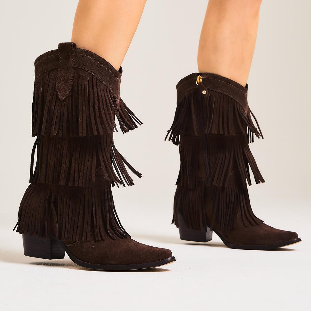 Ref: Autêntica e cheia de personalidade, esta bota feminina em camurça é a escolha perfeita para quem deseja elevar o look com um toque fashionista e contemporâneo. O design inspirado no estilo western ganha destaque com franjas em camadas, que criam movimento e atitude a cada passo. Versátil e elegante, transita com facilidade entre produções urbanas e composições boho chic. Ideal para combinar com vestidos fluidos, saias midi ou jeans ajustados, é aquele item statement que transforma qualquer visual com estilo e sofisticação.