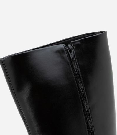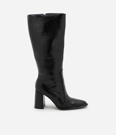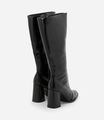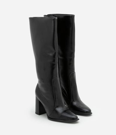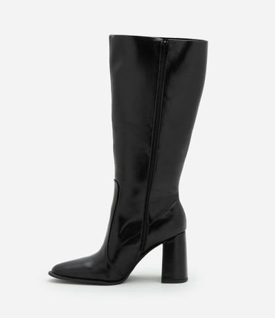 Bota feminina confeccionada em material sintético, com cano alto e bico amendoado. Possui salto bloco alto, com 8,8cm e fechamento por zíper.