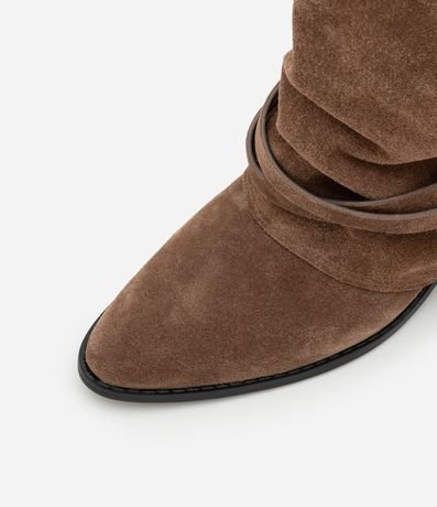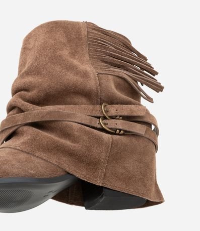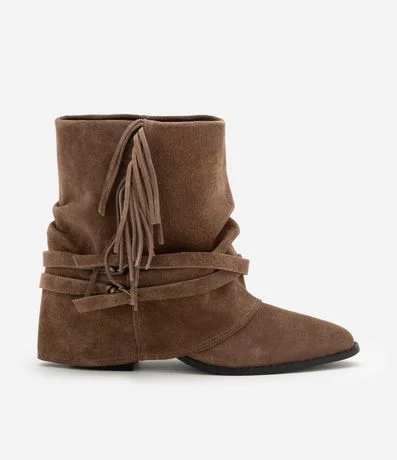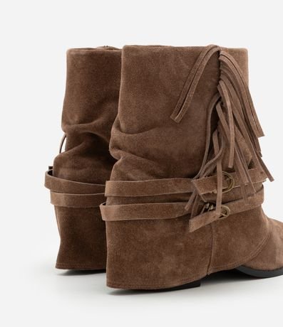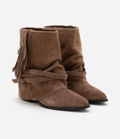 Ref: Bota cano médio feminina, com cabedal confeccionado em camurça. A peça possui dobra no cano, detalhes de franjas e amarrações e bico fino.