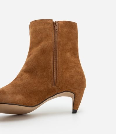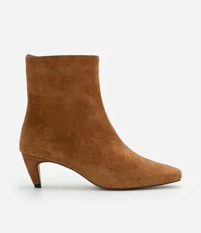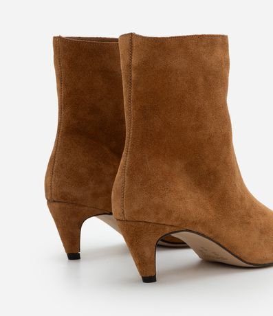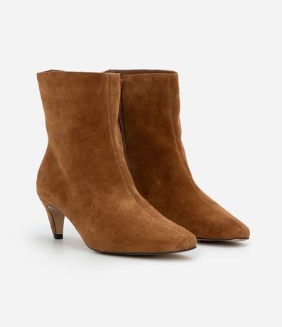 Ref: Bota feminina em couro com acabamento aveludado, cano médio, recorte traseiro, bico quadrado alongado, salto baixo levemente curvado e costuras discretas.